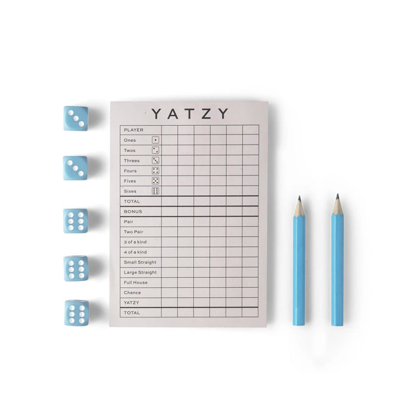 Inneholder 5 terninger, 2 blå blyanter og 50 spillark.